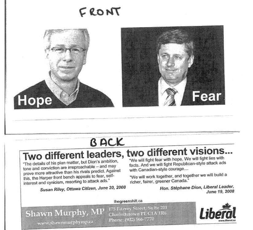 Take a look at the following ten-percenter that landed in mailboxes in Burlington ON (from a PEI MP printed on dead trees! Someone call Garth).