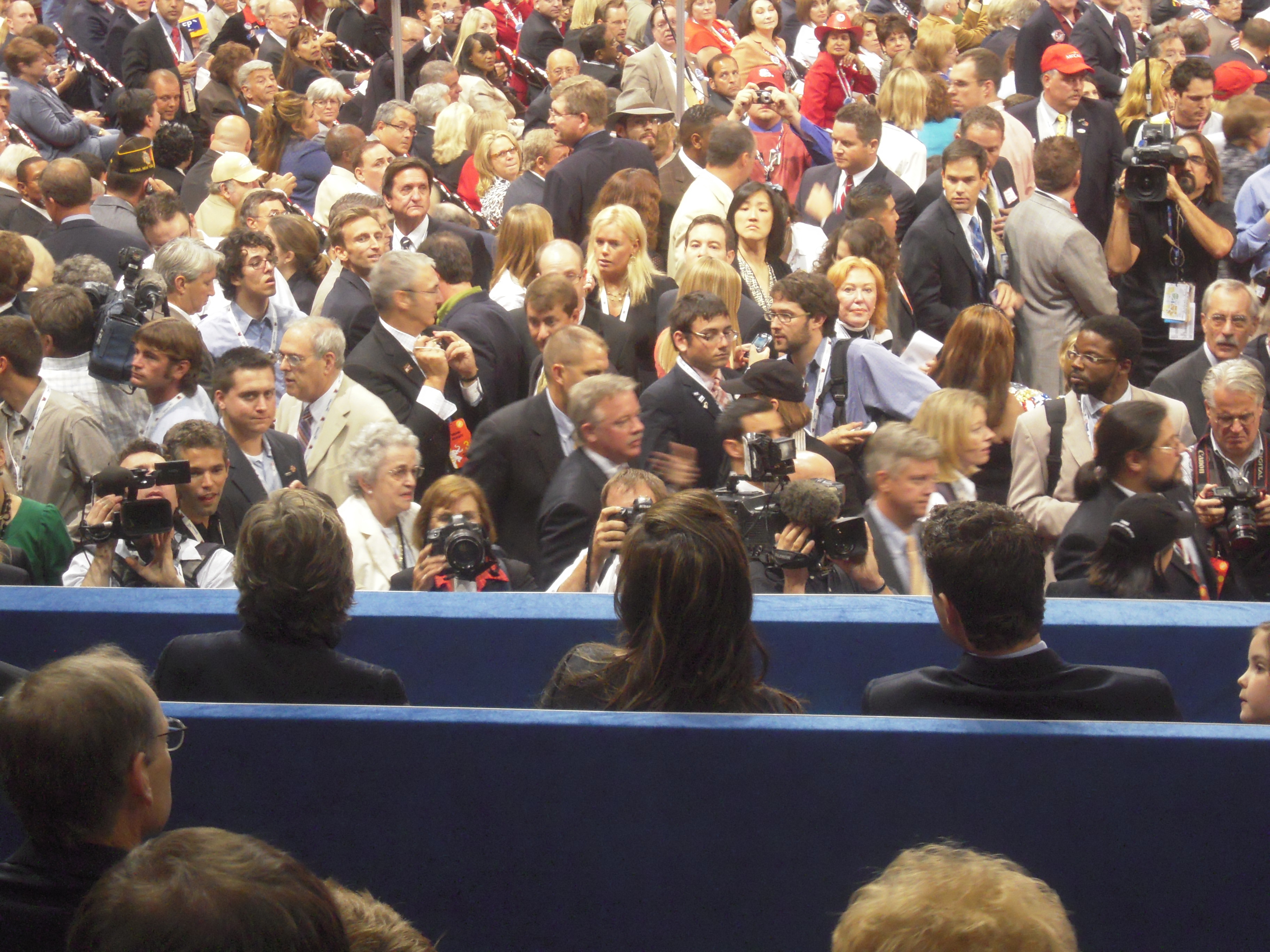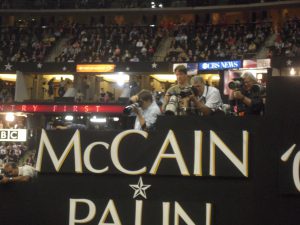 A riser (top-left) focuses their attention and telephoto lenses on Palin’s family. At the time, the Governor of Hawaii was speaking on stage making introductory remarks about Sarah Palin. Nobody seemed to notice.