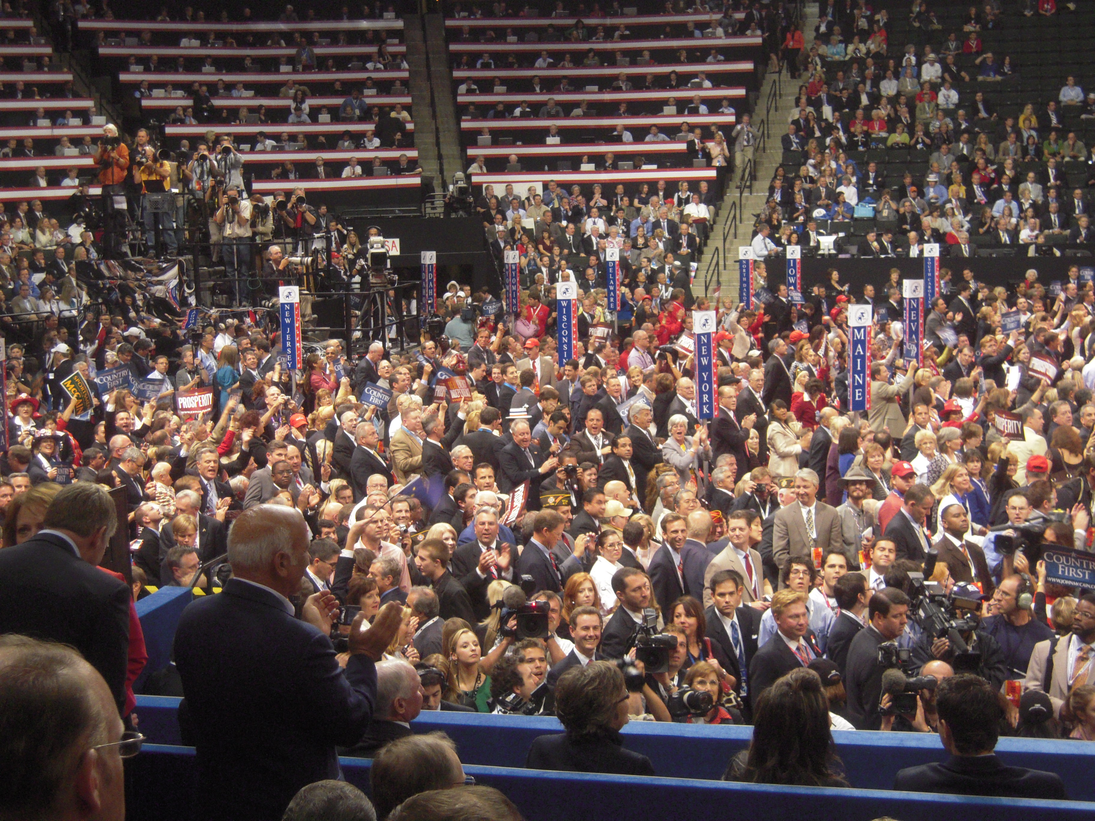 – Michigan delegates wore hockey jerseys emblazoned with “RNC”. They chanted “hockey mom” at Sarah Palin during the speech. Palin recognized them and seemed to integrate it as a point in her speech.