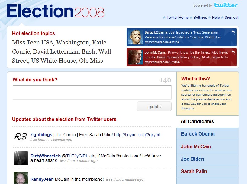 Twitter Election 2008, like its predecessor called govtweets.com that I coded, aggregates twitter mentions of John McCain, Barack Obama, Joe Biden and Sarah Palin in real-time as a constant stream of data updated using asynchronous javascript and xml (AJAX).