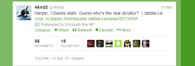 Elizabeth May’s schtick besides climate change has been about her views on democracy in Canada — specifically what she characterizes as the erosion of it. Now, retweets are not necessarily endorsements, but May recently wrote the Queen about the robocalls scandal and the Rabble infographic includes a quote from Jimmy Carter praising Chavez for his democratic ideals while includes quotes from Elections Canada on those robocalls.