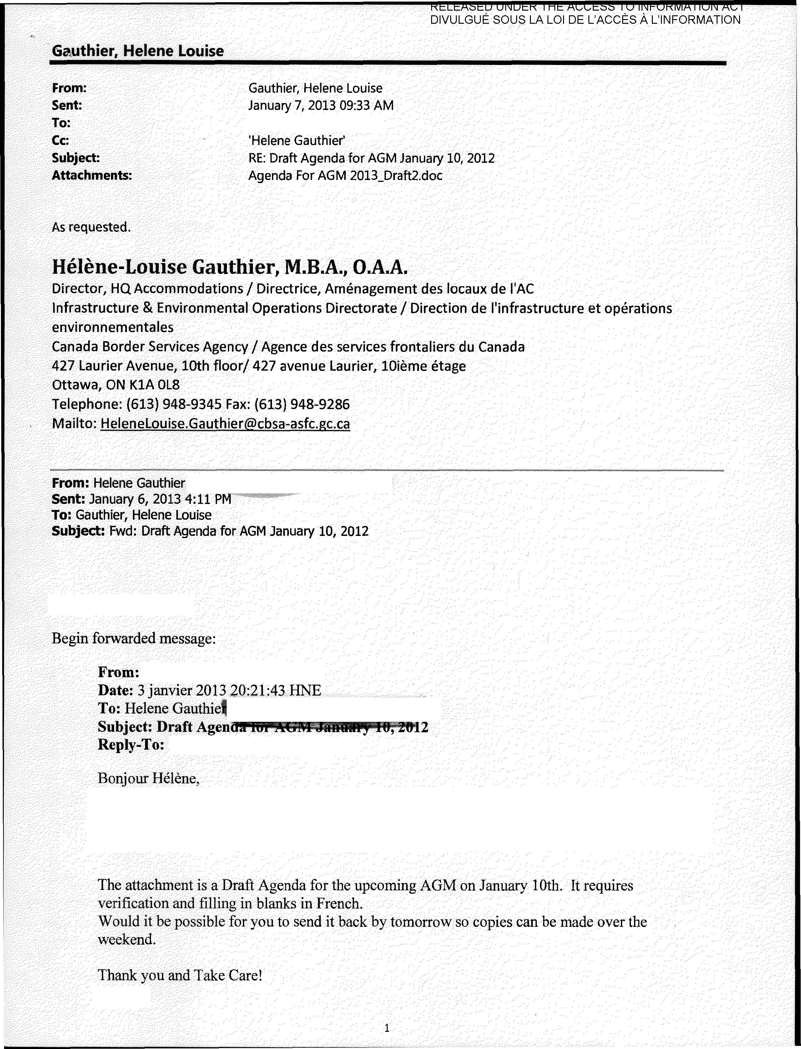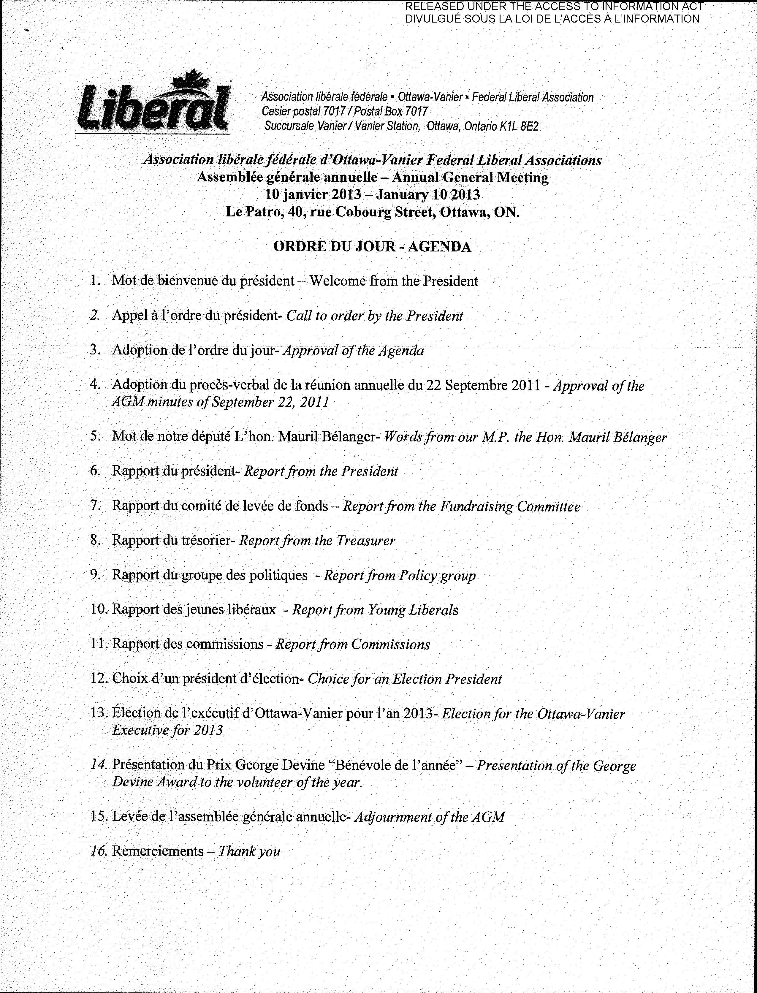 This request from the Liberal Party was fulfilled using a Government of Canada email address. It is unknown if this was done on government time despite government resources being used to respond to the request. The translated document was the agenda for the 2013 Liberal Ottawa-Vanier AGM.