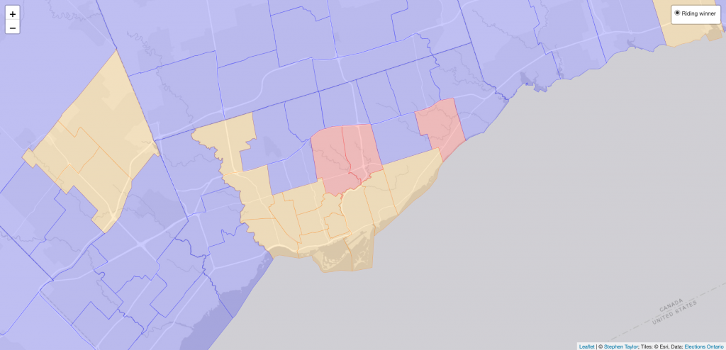 There’s a search bar at the top of the app as well so you can easily zoom around the province if you know the riding you want to look at but can’t exactly remember its geospatial position. Future updates will include a method to jump around to neighbouring ridings and to look at the results of previous Ontario elections in context. I’ve already added these features to my federal maps, so do check those out as well if you believe that the 2021 federal election provides some helpful context for this current provicial election.