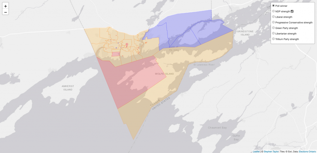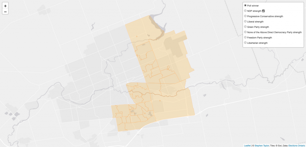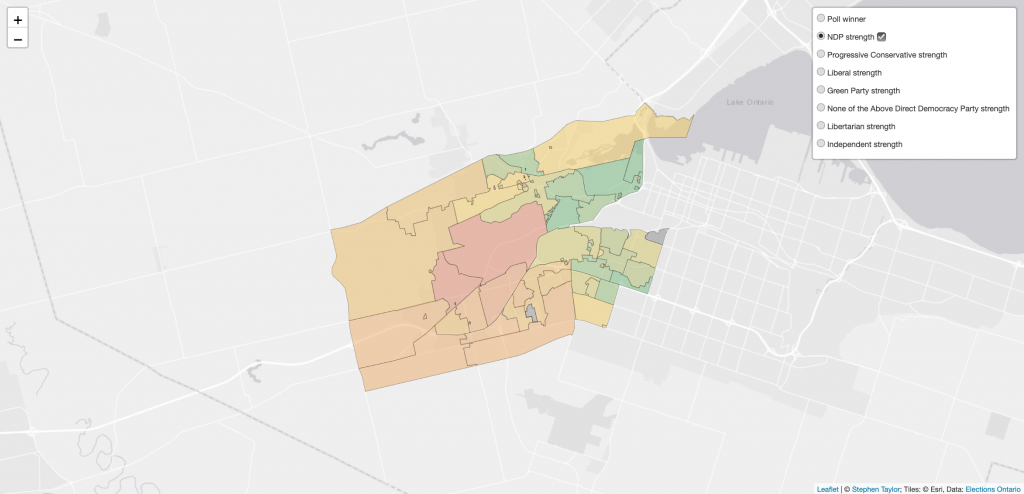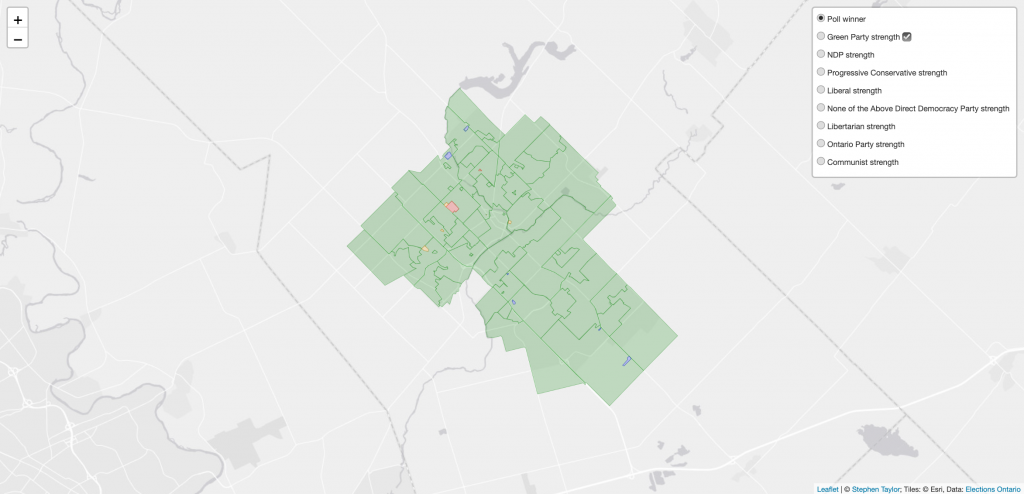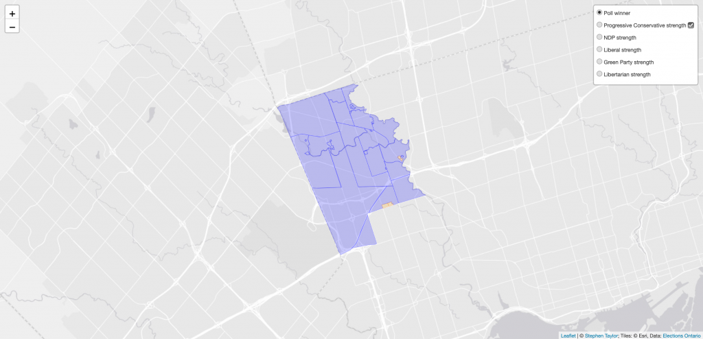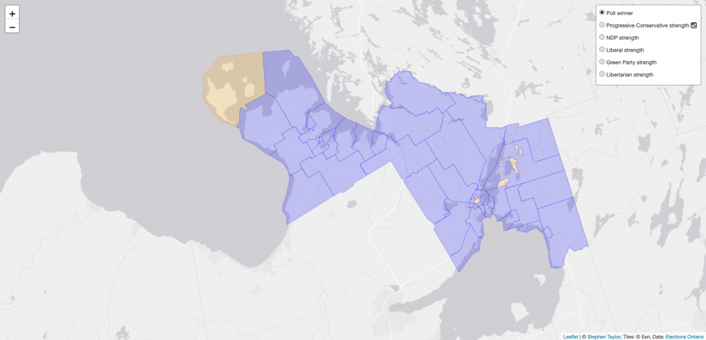 I’ve mapped out areas of strength in each riding for each candidate that ran in 2018. Whether your party was successful or not in your local riding, you can see where it’s strength is growing or declining and these maps can help you focus on neighbourhoods where you can get out the vote. Whether you’re actively campaigning or not, you can also use these maps to see the distribution of party strength geographically within a riding using these strength/weakness settings for the poll-by-poll maps. How did your neighbours vote? Find out!