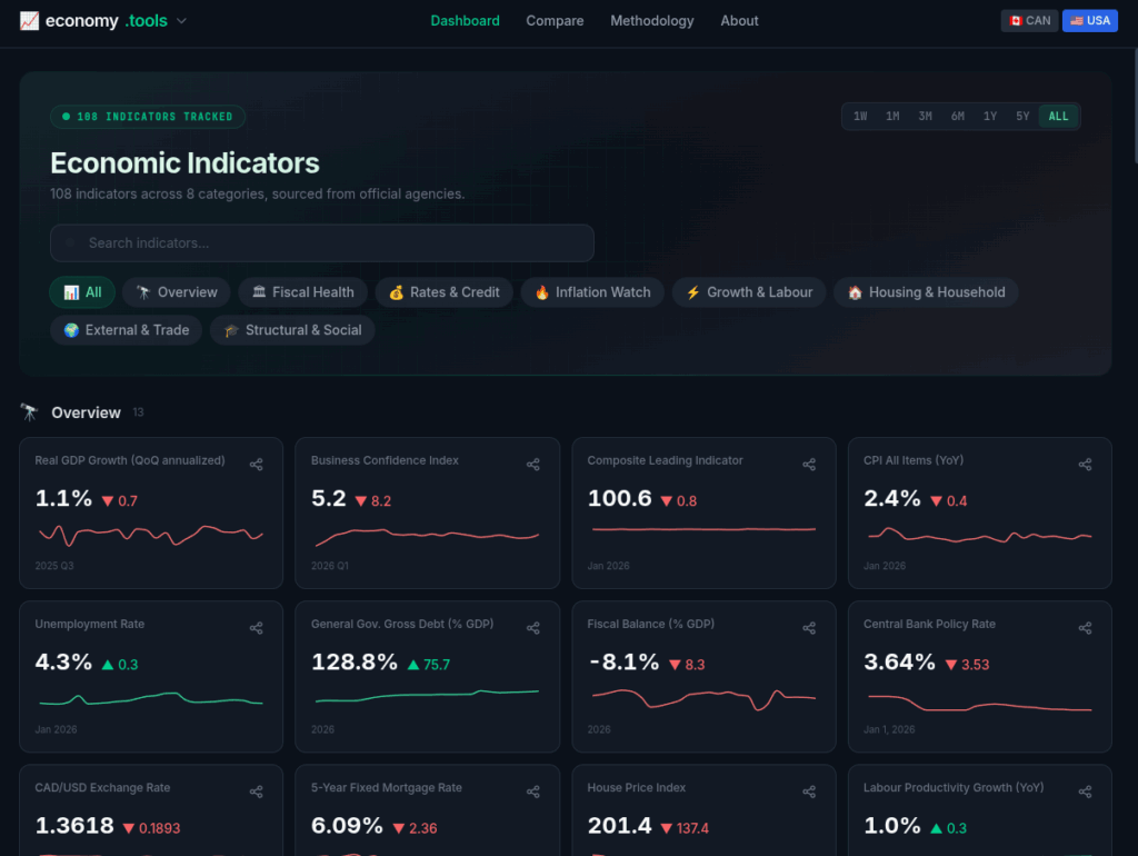 economy.tools is a free, open dashboard that tracks 109 economic indicators for Canada and the United States. Every number comes directly from an official source. No opinions – the data speaks for itself.